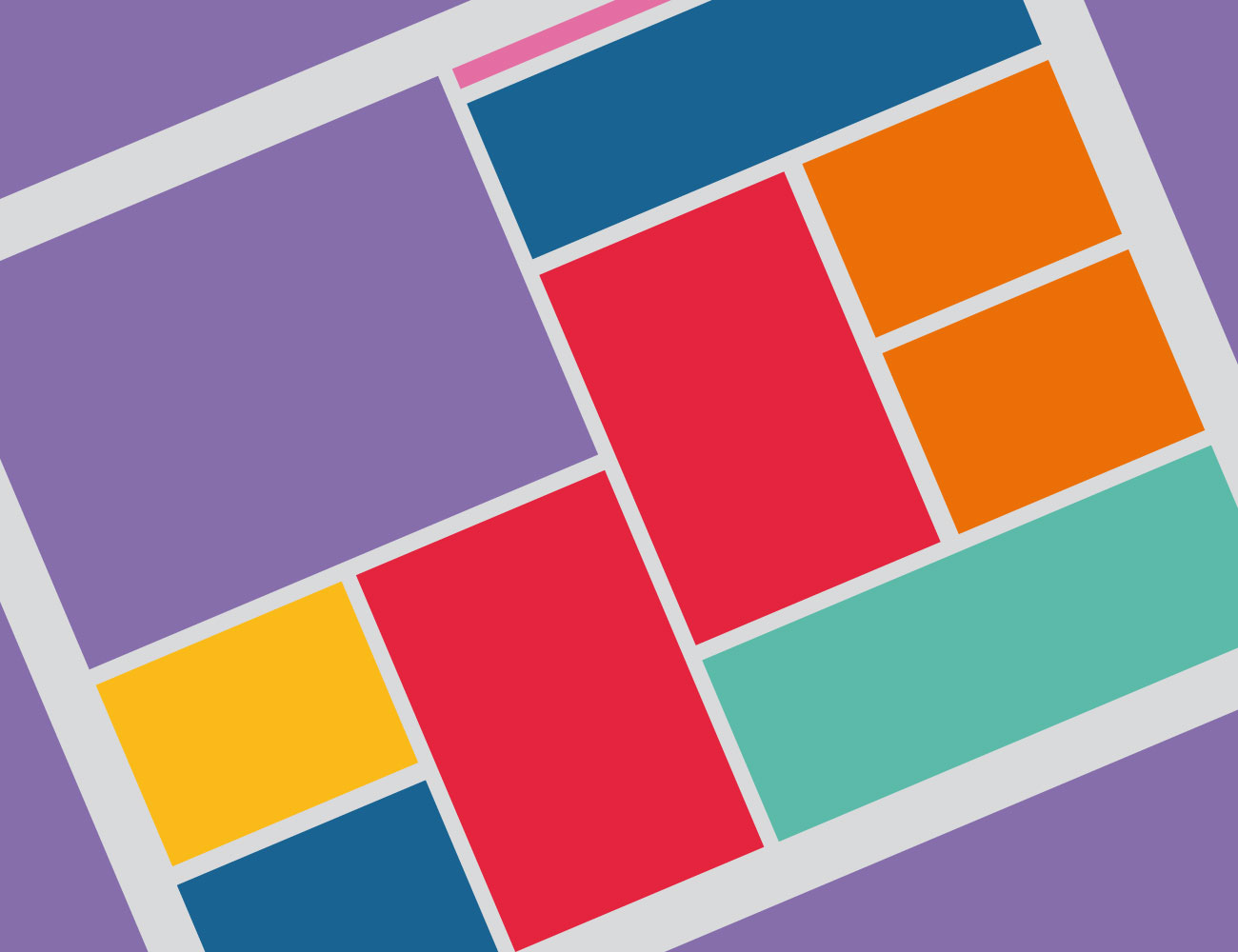 Una vez elaborada la retícula, uno de los mayores peligros es caer en cierta monotonía que de como resultado un producto gráfico lineal y aburrido. Para otorgar dinamismo a tu proyecto, es importante sacar el rendimiento oportuno a la capacidad de variación compositiva que posee tu retícula. A continuación, te presentamos un ejemplo de dobles páginas en las que los módulos azules representan los bloques de texto y los magentas las imágenes.